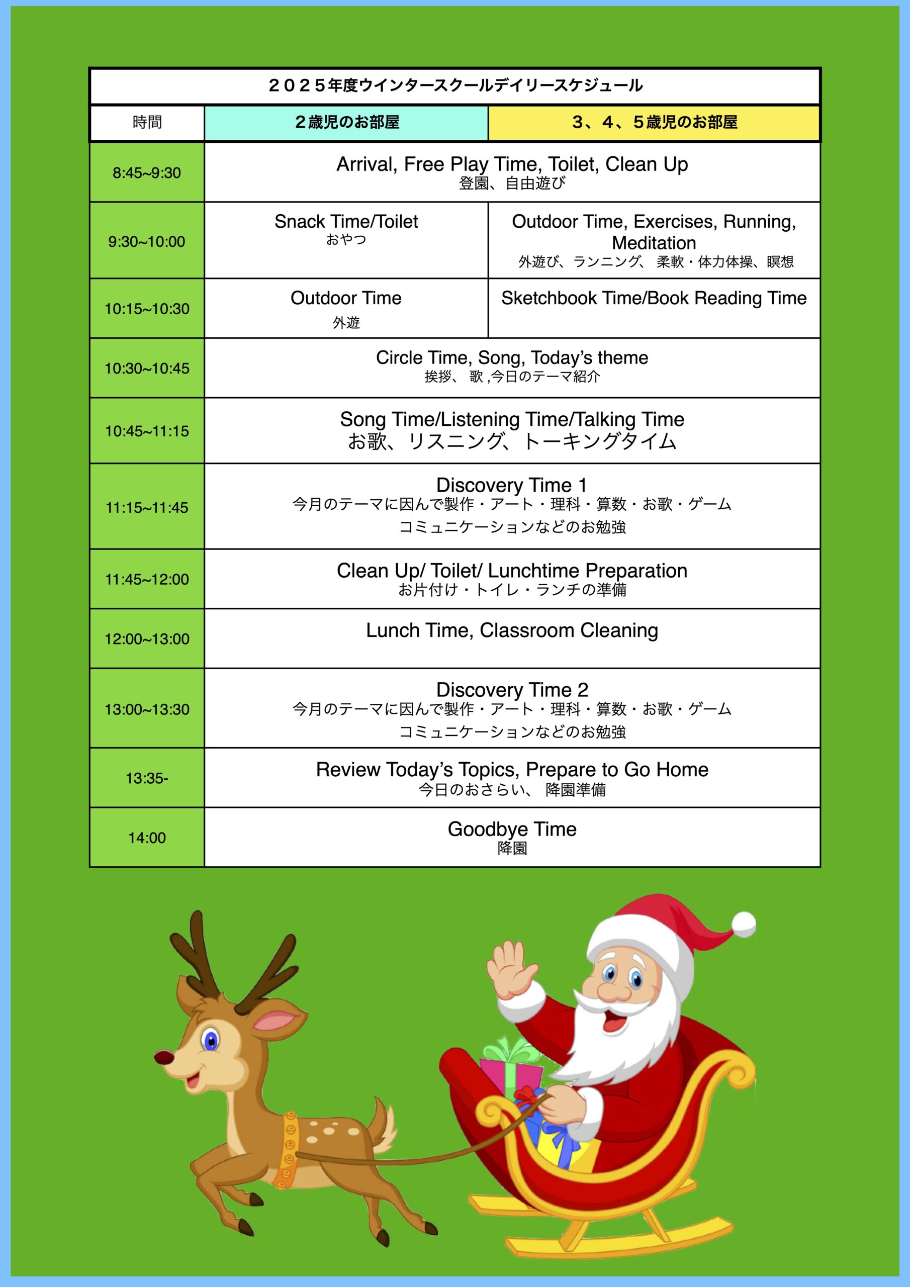 *1 year-old class is limited to minimum age 1.5 years, and for children who are physically able to eat lunch by themselves.